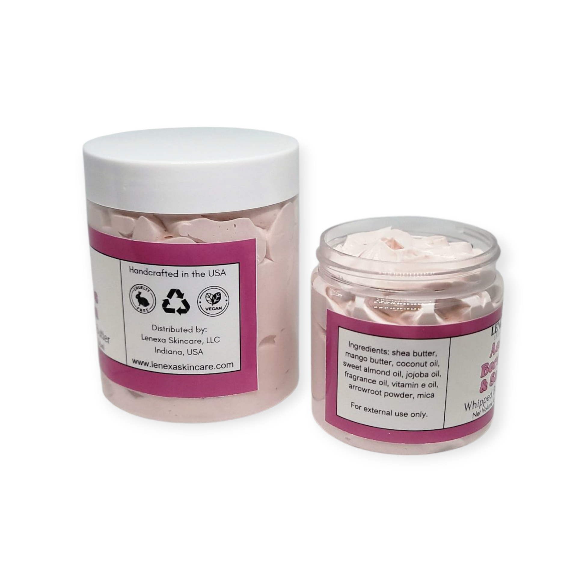 Ingredients: Shea butter, mango butter, sweet almond oil, coconut oil, jojoba oil, vitamin e oil, fragrance oil, arrowroot powder, mica